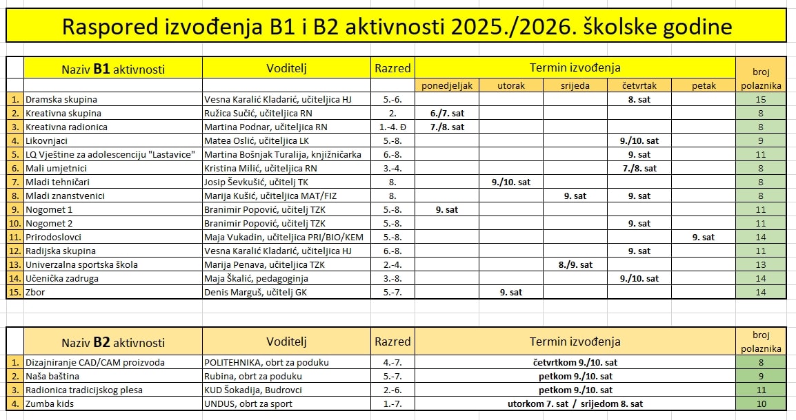 Izvannastavne (B1) i izvanškolske (B2) aktivnosti koje se provode u našoj školi u školskoj godini 2025./2026.: