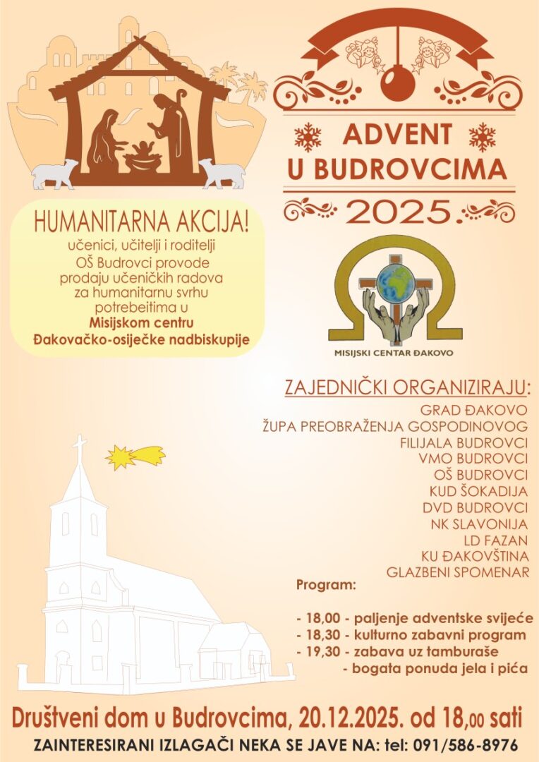 Ove godine Advent u Budrovcima održat će se 20. prosinca, a naša će škola sudjelovati prodajom učeničkih rukotvorina i prikupljanjem dobrovoljnih priloga u humanitarne svrhe. Posebno ističemo i dodatnu aktivnost – prikupljanje kuna i njihova zamjena u eure, kako bi i preostala sredstva u staroj valuti bila uključena u ovu humanitarnu inicijativu.