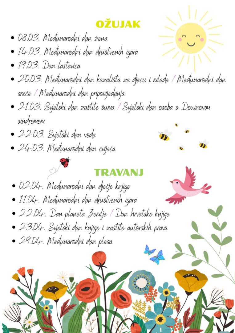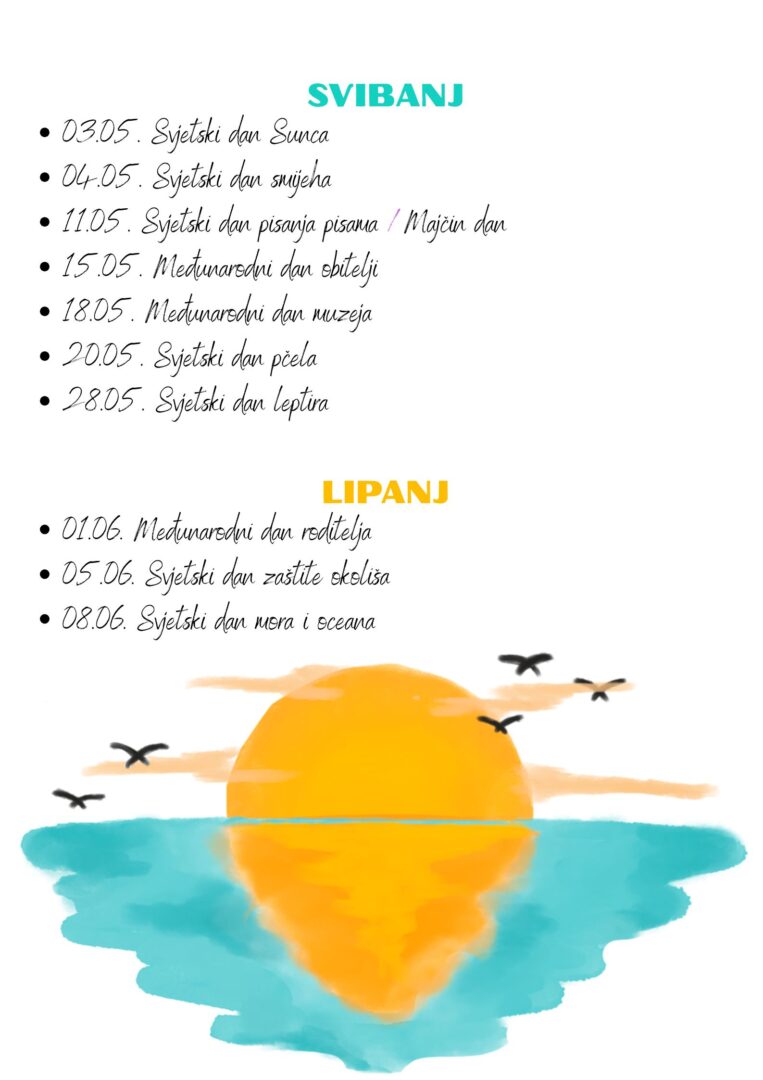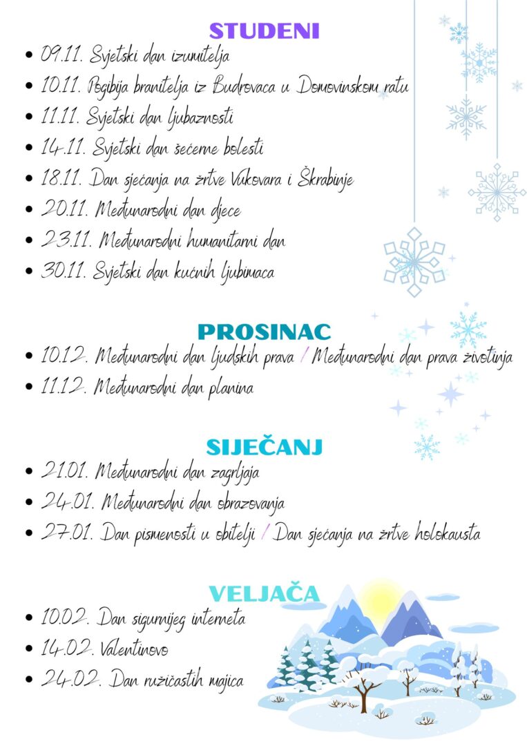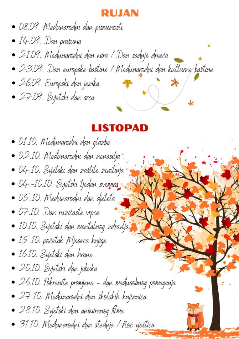 Na ovoj stranici možete pronaći popis svih važnih i zanimljivih datuma koje se trudimo svake godine obilježiti u našoj školi. Neke aktivnosti učitelji i stručni suradnici provode individualno u sklopu sata razrednika ili drugih sati usko vezanih uz dan koji se obilježava, dok druge obilježavaju u suradnji jedni s drugima. Većina provedenih aktivnosti zabilježena je na fotografijama i objavljena na mrežnoj stranici naše škole kao i na Facebook stranici.